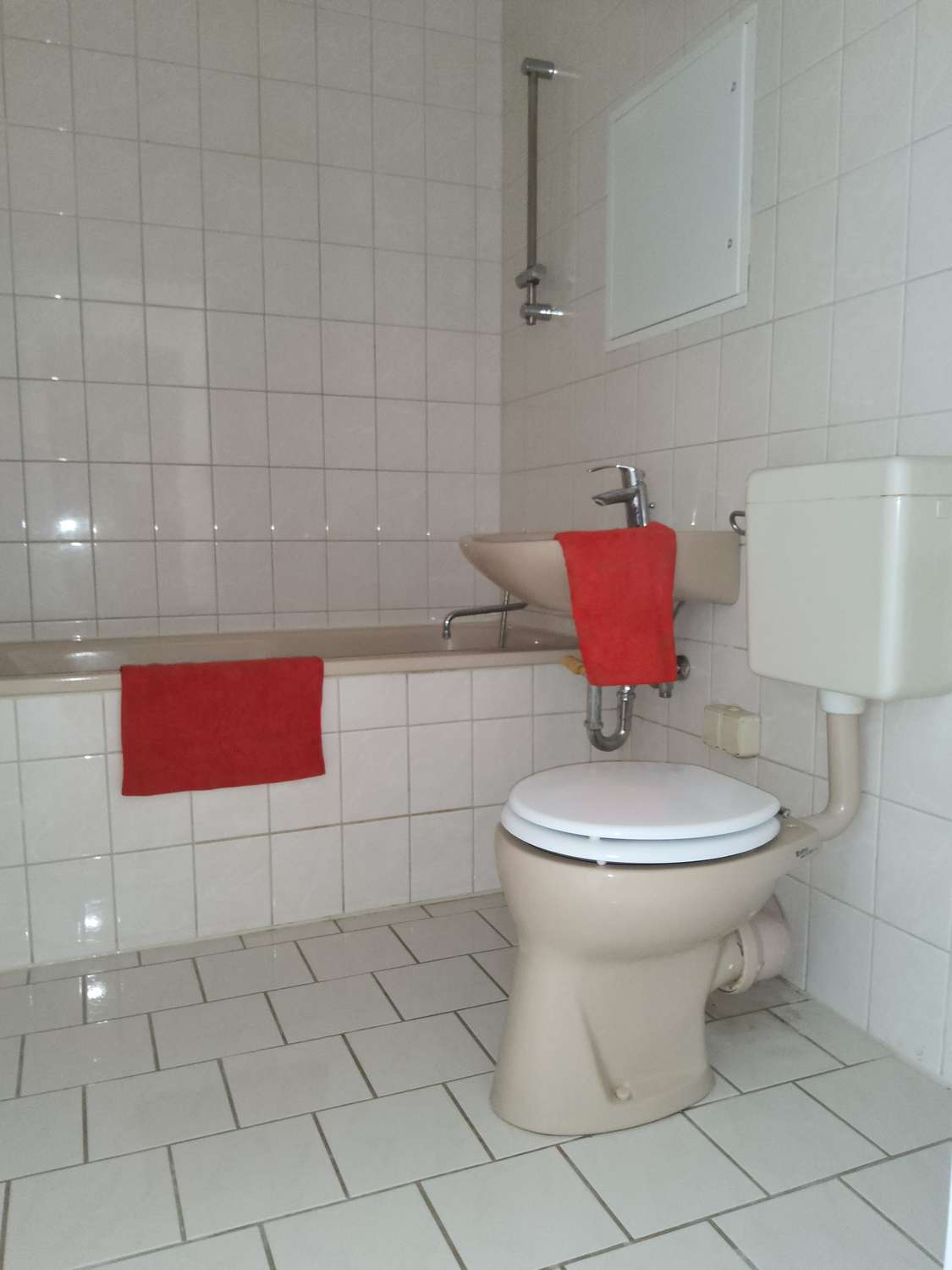 gefliestes Bad mit Badewanne, Balkon, Aufzug