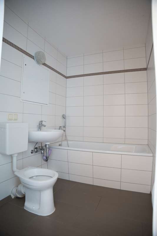 modernisiertes Bad mit Badewanne, Fußbodenfliesen in der Küche, Fußboden im Wohnzimmer, Flur, Schlaf- und Kinderzimmer ist mit PVC-Belag ausgestattet.