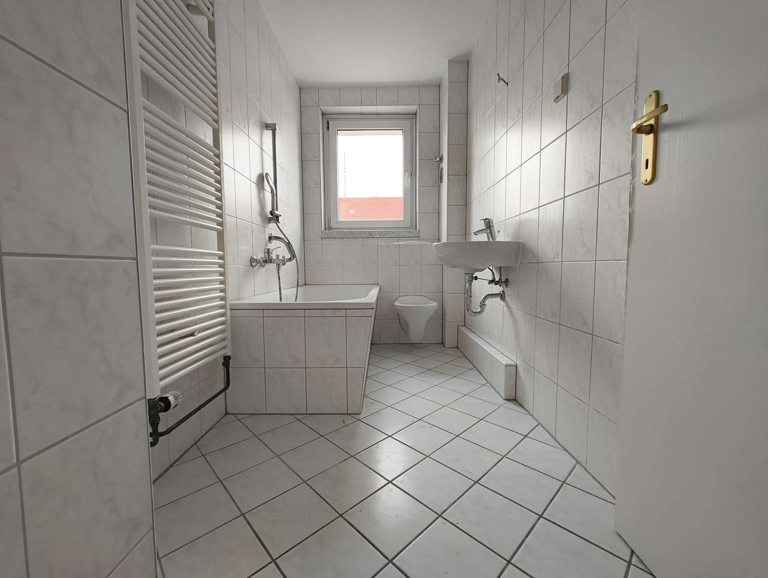 gefliestes Tageslichtbad mit Badewanne